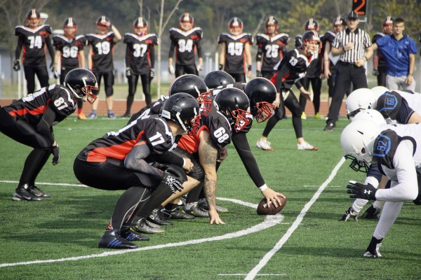 Розыгрыш мяча на матче по американскому футболу