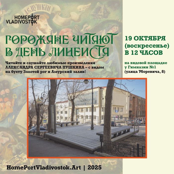 Приходите слушать и читать свои любимые тексты Александра Сергеевича Пушкина – с видом на бухту Золотой рог и Амурский залив! Собираемся в этот день, потому что 19 октября 1811 года был открыт Императорский Царскосельский лицей: здесь Пушкин учился, и лицей стал для него важным жизненным и творческим этапом.