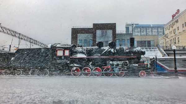 Старинный паровоз на платформе железнодорожного вокзала